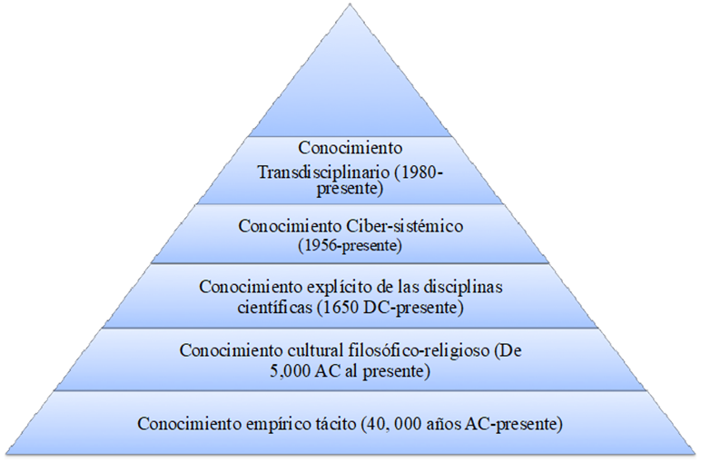 Se considera transdisciplinario porque es un conocimiento más amplio, universal, que incluye conocimiento tácito y conocimiento explícito (teórico) (Figura 6). De ahí que nuestra clasificación esté enfocada en identificar el tipo de escala de conocimiento existente en las propuestas teóricas de la comunicación. Además, al ubicar las temporalidades se puede comprender cómo la comunicación se fue complejizando al integrar cada vez más entidades y relaciones para su estudio. En ese proceso de integración progresiva el resultado siempre es una teoría más integrada y que, por supuesto, son más escasas.