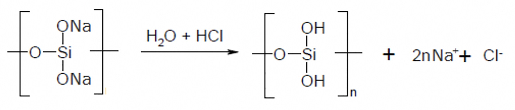 Los esquemas siguientes ilustran la secuencia de reacciones que conducen a la modificación de la sílice, basadas en el principio de la reacción de TMS. El silicato de sodio bajo las condiciones de hidrólisis ácida de la reacción forma ácido polisilícico y cloruro de sodio (reacción 1):
