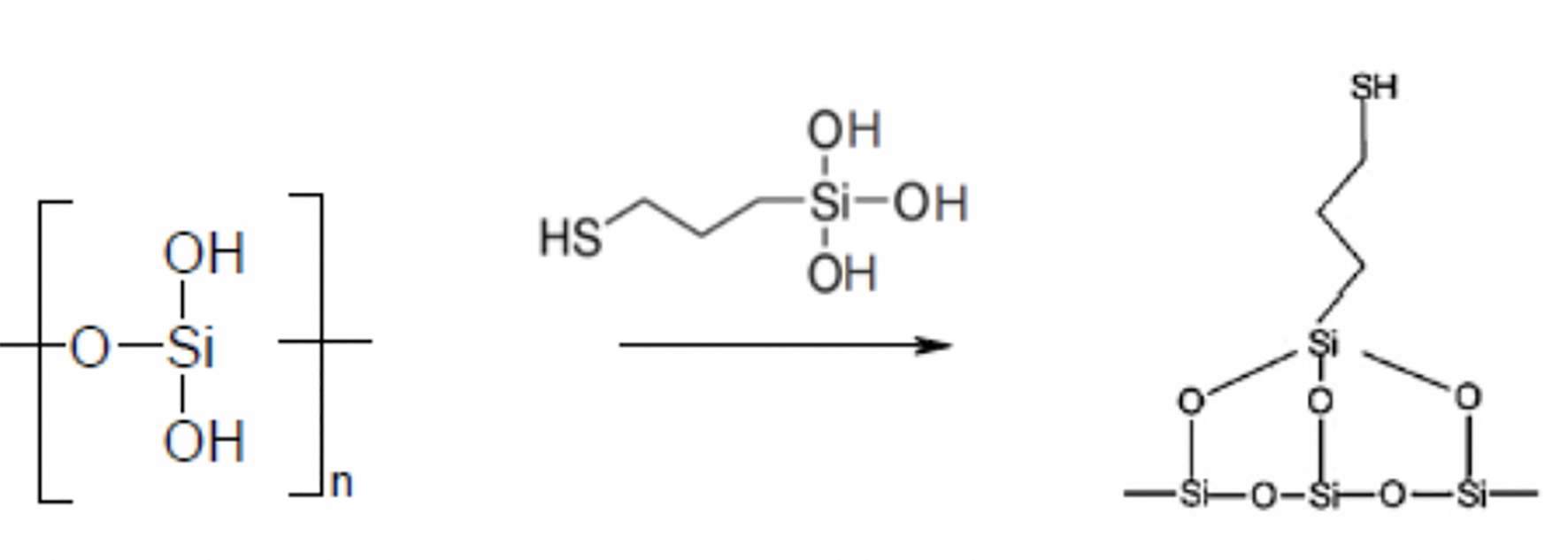 El reactivo de sililación, el 3-mercaptopropiltrimetoxisilano bajo las mismas condiciones forma el correspondiente silanol, por hidrólisis de los grupos trimetilsiloxi (reacción 2):