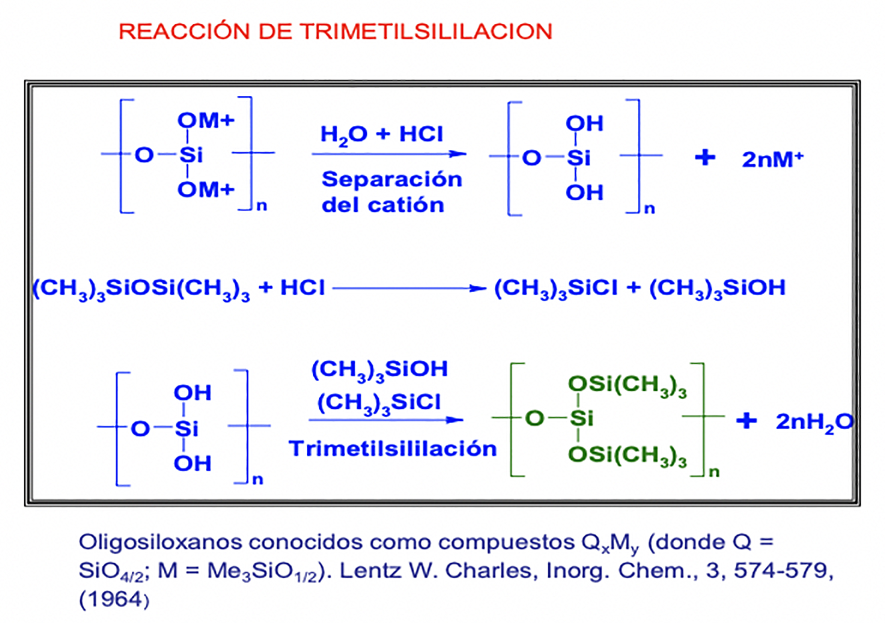 La reacción de trimetilsililación (TMS) fue propuesta por Charles W. Lentz en 1964. Lentz (1964) reportó que los silicatos olivino, hemimorfita, sodalita, natrolita, laumontita y silicato de sodio comercial pueden ser sililados con una mezcla de hexametildisiloxano, ácido clorhídrico, alcohol isopropílico y agua. La trimetilsililación de silicatos minerales implica la remoción de cationes metálicos, la formación de ácido silícico y la condensación de grupos trimetilsilanol.