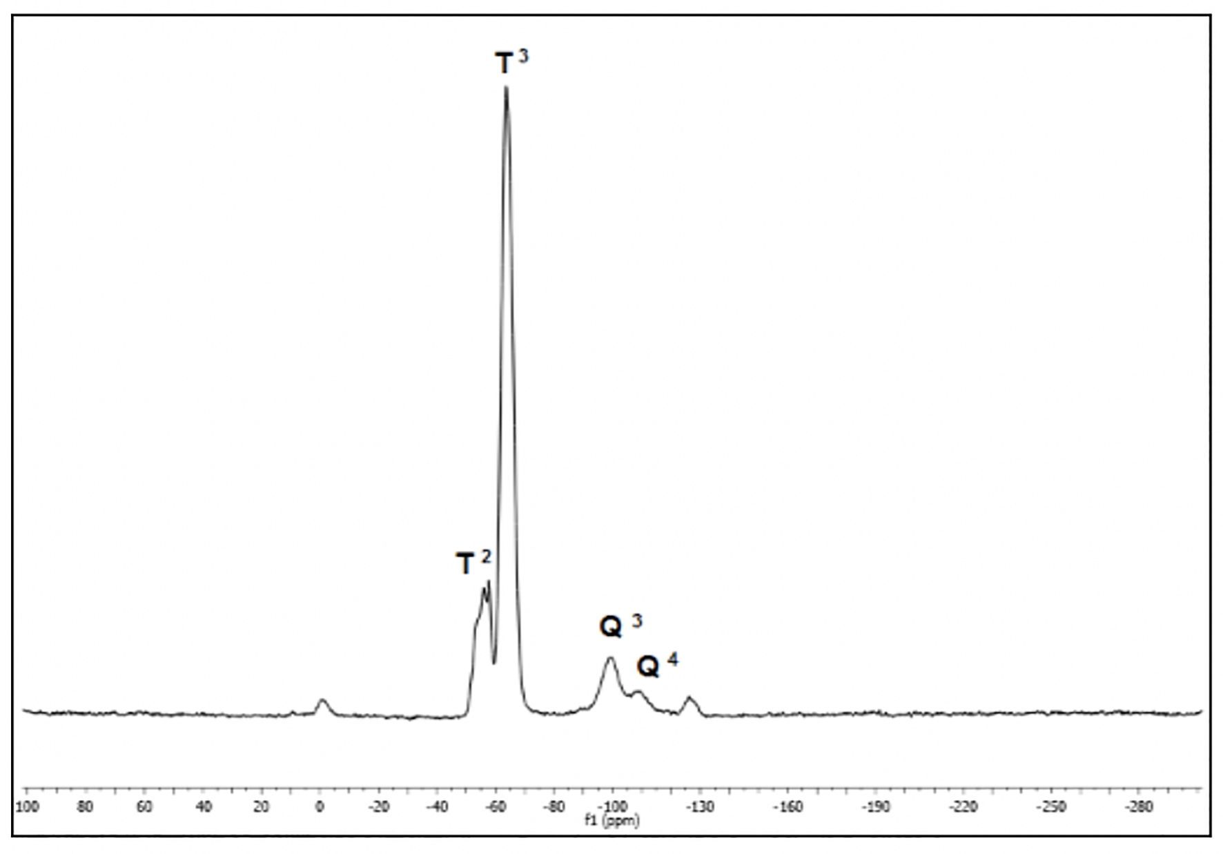 En la Figura 6, se presenta el espectro CPMAS de 29Si con las señales a -56 ppm, -64 ppm, -99 ppm y -109 ppm que se asocian con estructuras del tipo T2 (Si[OH]CH3 [OSi] 2), T3 (SiCH3 [OSi] 3), Q3 (Si[OH]/OSi) 3, y Q4 (Si(OSi) 4), respectivamente; todas ellas consistentes con lo esperado; es decir, los grupos T debido al anclaje del grupo trimetilsiloxi a la superficie de la sílice (dos señales T debido a la presencia en una de ellas de grupos silanol) y los grupos Q (Q3 ambiente donde hay además de uniones Si-O también Si-OH y la Q4 con el ambiente químico de grupos Si-O del bulto).