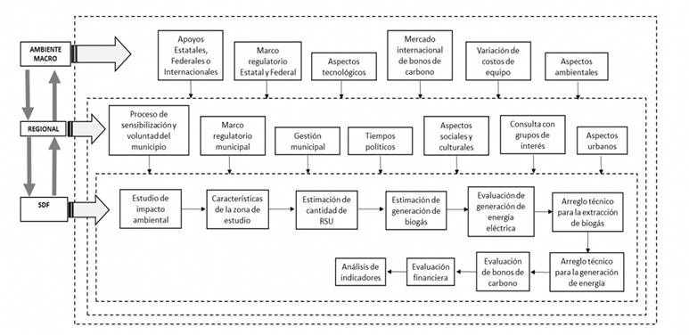 Para reducir algún tipo de riesgo en proyectos de biogás a partir de RSU es importante considerar un análisis sistémico, donde se estipulen los recursos y necesidades en el ciclo de vida del proyecto y se identifiquen las fuentes potenciales de riesgos como parte de la evaluación económica-financiera del proyecto considerando un entorno dinámico. La viabilidad técnico y financiera, enmarcadas en el primer nivel (interno) de la metodología, permiten su utilización con variables y factores que pueden llegar a ser complejos; sin embargo, en los siguientes niveles (regional y macro), los factores a considerar se vuelven más complejos tanto para medir como para predecir.