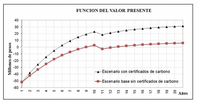 Se utilizó la fórmula del VPN, con una TD del 10% de acuerdo a lo estipulado por el BID (Campos, Serebrisky & Suárez-Alemán, 2016), un precio de referencia de la energía de 2.315 pesos/kwh en tarifa 5A tensión media (Comisión Federal de Electricidad [CFE], 2016), con un descuento de 20% para hacer atractiva su venta (1.852 pesos/kWh), un factor de planta de 90% que va de acuerdo con lo que proponen Vera et al. (2015) y venta de certificados de carbono.. La Figura 4 muestra los resultados del comportamiento del VPN a través de los años y la Tabla 9 los resultados de la evaluación financiera.