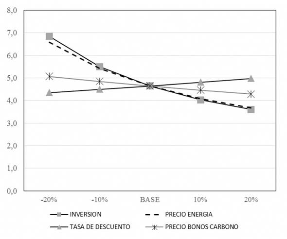 De la Figura 7 se observa que cuando el precio de venta de la energía disminuye, el tiempo de recuperación de la inversión aumenta y, como la valoración se sustenta en la venta de la energía eléctrica, es la variable que más afecta. La variable del precio de venta de la energía es la de mayor sensibilidad y la variable del precio de los CER es la de menor sensibilidad.