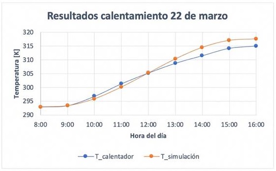 La Figura 10 muestra los resultados de la prueba realizada el día 22 de marzo. La prueba inicia a las 8:00 h, con una temperatura de 294 K (21 °C), y termina a las 16:00 h, con una temperatura 315 K (42 °C); un incremento de temperatura de 21 K en ocho horas de exposición solar. La radiación solar máxima registrada fue de 1100W/m2 a las 15:00 h.