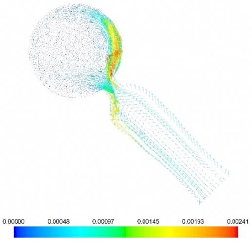 En la Figura 9 se muestra el movimiento del agua dentro de las botellas y del tanque de almacenamiento de agua debido a los cambios de densidad, el cual se conoce como efecto termosifón. El agua caliente por la radiación solar hace que exista una diferencia de densidades en el fluido que se ubica en la parte superior de las botellas y se mueve hacía el tanque, mientras que el agua fría, como es más pesada, se mueve hacía la parte inferior de las botellas. Para lograr este efecto termosifón dentro de las simulaciones numéricas CFD, se hizo uso de polinomios para permitir la variación de las propiedades del agua con la temperatura, entre estas, la densidad.