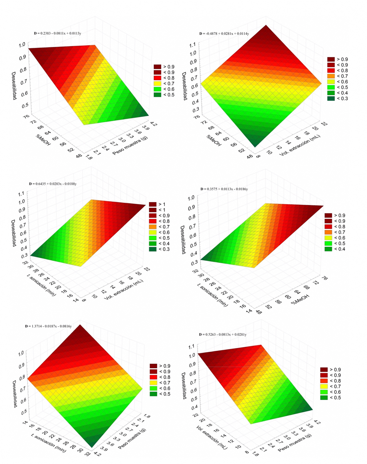 Después de haber realizado los experimentos, se obtuvieron las áreas de cada uno de los plaguicidas y se realizó el tratamiento estadístico con el software STATISTICA, obteniéndose los gráficos de superficies de respuesta en términos de la deseabilidad (D). En la Figura 3 se muestran los gráficos de superficies de respuesta en los cuales se grafica el factor de D vs. dos factores. A partir de estas superficies de respuesta, se definieron los valores óptimos para cada factor: el peso de la muestra de 2 g, el volumen de extrayente a 20 mL, la proporción de porcentaje de metanol con 75% y el tiempo de sonicación a 15 min.