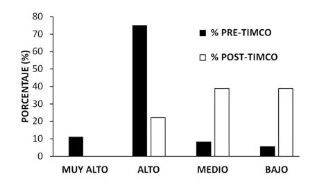 Posterior a las 10 sesiones de intervención TIMCO, el total de los padres y profesores expresaron verbalmente una mejoría en los niños con intervención TIMCO. En la Figura 1 puede observarse que hubo un desplazamiento desde los puntajes muy altos hacia los puntajes medio y bajo cuando se compararon los porcentajes de los niños con TDAH segmentados en escala EDAH como: muy altos = 10, altos = 9, medios = 7-8, y bajos = 5-6 en las pruebas pre- y post-TIMCO.