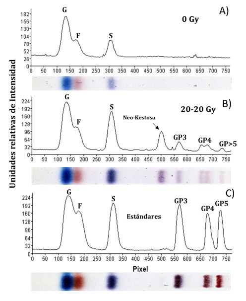 Así mismo los resultados mostraron que las dosis de radiación aplicadas indujeron mutaciones en las plantas in vitro de Agave tequilana que afectaron la acumulación de los fructooligosacaridos en los tallos de las generaciones mutantes evaluadas. Al realizar el análisis por HPTLC, se observó que la concentración de glucosa disminuyó en las dosis de 10 Gy, 15 Gy y 20 Gy en plántulas correspondientes a las generaciones M1 y M2-10, aumentando a los 25 Gy, alcanzando en la M1 un incremento significativo y estadísticamente igual a la dosis M2-20-20 (Figura 3), mientras que esta generación tuvo un incremento en la concentración de fructosa, diferenciándose estadísticamente del resto de las dosis evaluadas. Por otra parte, en la generación M1 el incremento no fue significativo respecto al tratamiento control en las dosis de 10 Gy, 15 Gy y 20 Gy; y para la generación M2-10 Gy no hubo diferencia estadística en las dosis de radiación y el testigo. En la concentración de sacarosa se presentó un comportamiento similar en las dosis de 20 Gy en las generaciones M1 y M2-20. En general se observó que las plantas de Agave tequilana irradiadas a 20 Gy y posteriormente sometidas a una segunda dosis de 10 Gy a 25 Gy fueron las más sobresalientes al acumular en un intervalo aproximado de una a dos veces más glucosa, 1.4 a 2.6 veces más fructosa y 1.4 a 1.9 veces más sacarosa, lo cual se aprecia en el perfil de separación por HPTLC, coincidente con los valores de la tabla 1. No se descarta el incremento en alguna invertasa, de la actividad de la sacarosa sintasa, incluso una fructanohidrolasa para justificar el incremento en estos carbohidratos, por lo que se requieren futuros estudios detallados en las diferentes actividades enzimáticas en el metabolismo de los carbohidratos para estas mutantes. La síntesis de fructanos comienza con las enzimas fructosiltransferasas (FT). La enzima sacarasa: sacarosa 1-fructosiltransferasa (1-SST) transfiere una unidad de fructosa de una molécula de sacarosa a otra, sintetizando la 1-kestosa (DP3: G-F-F). Posteriormente, la fructano:fructano 1-fructosiltransferasa (1-FFT) es capaz de incorporar una fructosa para incrementar el grado de polimerización. Enseguida, la enzima fructano:fructano 6G-fructosiltransferasa (6G-FFT) es la enzima clave para la síntesis de la neoserie de fructanos produciendo neokestosa (DP3: F-G-F), característica de las agavinas y que se observan claramente en la separación de FOS mediante HPLTC de la doble mutante M2-20-20 (Figura 4), lo que sugiere una elevada actividad de las enzimas FT, siendo esto altamente deseable para la industria. La línea clonal doblemente irradiada con 20 Gy (M2 20-20) fue el único lote de plantas que presentó una acumulación sobresaliente de FOS, además de mayor contenido de glucosa, fructosa y sacarosa (Figura 4), observando los isómeros de la neoserie en los grados de polimerización GP: 3, 4 y 5 previamente identificados por nuestro grupo de trabajo para Agave tequilana (Suárez-González et al., 2016).