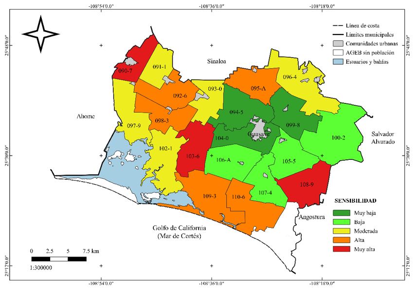 Como se indicó líneas arriba, la sensibilidad frecuentemente es un elemento determinante de la vulnerabilidad. Sin embargo, normalmente no se ha estudiado de manera independiente. Ante esta situación y considerando que las áreas rurales son de las más vulnerables ante los impactos del cambio climático, debido a su alta sensibilidad, el objetivo del presente estudio fue evaluar la sensibilidad de áreas rurales expuestas a la variabilidad y el cambio climático con la ayuda de un conjunto de indicadores y utilizando como unidad de análisis el AGEB. Dicho estudio se desarrolló en el área rural del municipio de Guasave, Sinaloa, cuyos medios de vida dependen fuertemente de actividades primarias como la agricultura, la pesca y la ganadería. Derivado se los resultados, y de manera general, se proponen algunas acciones enfocadas en fortalecer ciertos aspectos poblacionales con el propósito de disminuir la sensibilidad de la región de estudio ante la variabilidad y el cambio climático.