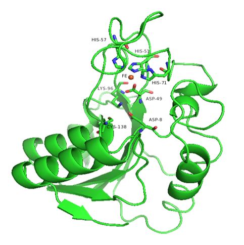 Figura 1 Representación de la estructura tridimensional proteica de MtPncA para la muestra H37rv. Se representan los residuos importantes para la catálisis (Asp 8, Lys 96 y Cys 138) y los residuos involucrados con la unión del cofactor enzimático (Asp 48, His 57 y His71); el ion de hierro se representa con una cruz roja.
