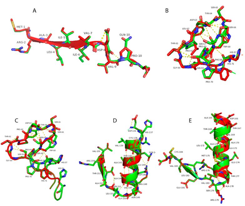 La mutación P62L está presente en un giro donde se encuentra un sitio importante para la unión del cofactor enzimático, el efecto de esta mutación comienza en la histidina 57, observándose un ligero desplazamiento en el enlace peptídico. En ácido aspártico 63, serina 65 y serina 66 se observó que no se presentaba ningún cambio estructural; sin embargo, en el aminoácido serina 67, triptófano 68 y prolina 70 se observó un evidente desplazamiento (Figura 2B).