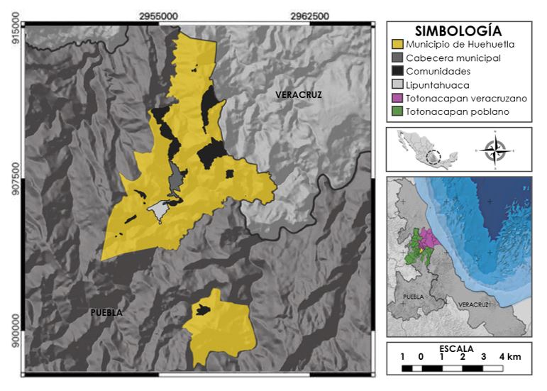 Este estudio se realizó con la comunidad de Lipuntahuaca, que pertenece al municipio de Huehuetla, ubicado sobre la Sierra Norte de Puebla, México (Figura 1). Este municipio cuenta con una extensión territorial de 56.9 km2 y una topografía caracterizada por una gran variedad de elevaciones en un paisaje de sierra alta escarpada, cuya altitud varía de 220 msnm a 1100 msnm, con un rango de precipitaciones de 2900 mm a 3600 mm, con un clima semicálido húmedo, con lluvias todo el año, y temperaturas de 18 °C - 24°C (Instituto Nacional de Estadística y Geografía [INEGI], 2009). De acuerdo con la CDI (2015), este municipio tiene 18 803 habitantes, de los cuales el 96.4% es indígena y el 89.8% es hablante de lengua indígena. Este lugar presenta uno de los mayores grados de rezago social a nivel estatal, ocupando el lugar 211 de 217 municipios, debido a que el 86.4% de su población se encuentra en condiciones de pobreza y 46.2% en pobreza extrema. Además, el Índice de Desarrollo Humano en sus servicios es de 0.74, mientras a nivel estatal este índice es de 0.86 (INEGI, 2017), de manera que el 80.8% de su población habita en viviendas sin disponibilidad de algún servicio básico (Sedesol, 2017). Debido a estas condiciones ha sido catalogado con un grado de rezago social y marginación muy alto. Las actividades agrícolas son el principal sustento económico de las familias indígenas en el municipio, siendo maíz, café, pimienta y vainilla los principales cultivos (Servicio de Información Agroalimentaria y Pesquera [SIAP], 2019).