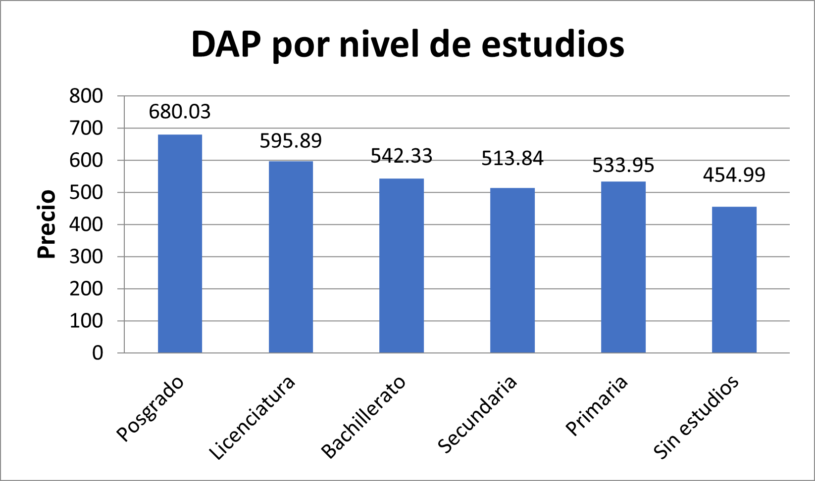 El coeficiente NEST muestra que, al tener mayor nivel de estudios, se incrementa la probabilidad de responder positivamente a la pregunta de la disposición a pagar por un mezcal con mejores características. En la Figura 1 se observa que, a mayor nivel de estudios, se tiene una mayor disposición a pagar. Por ejemplo, los individuos con posgrado están dispuestos a pagar $680.03 en promedio, a diferencia de los consumidores con un nivel de estudios de bachillerato, los cuales en promedio están dispuestos a pagar $542.33, y así sucesivamente hasta llegar al precio promedio de $454.99, para los individuos sin estudios.