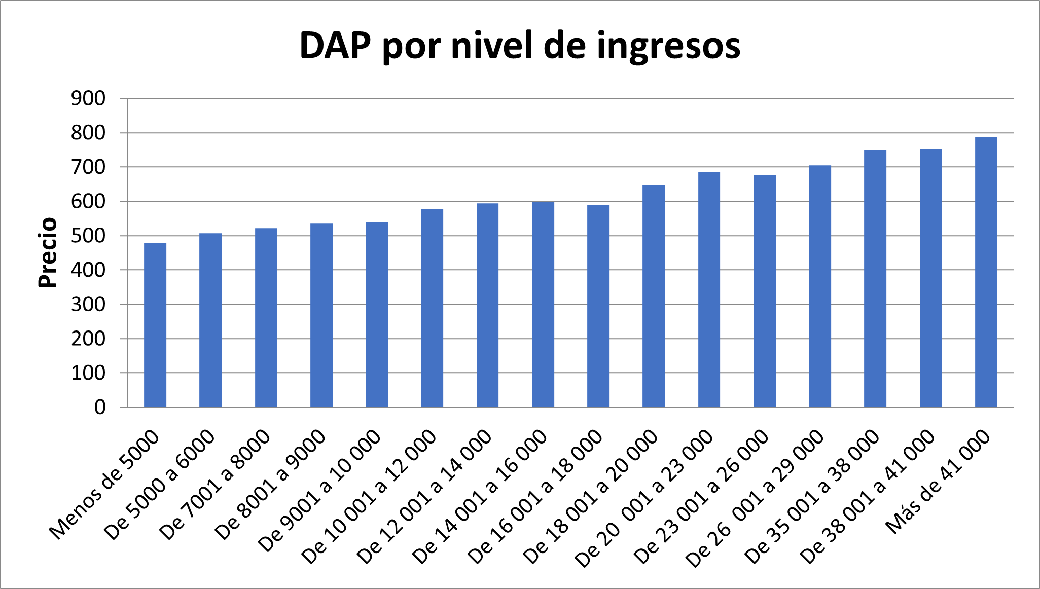 El coeficiente de la variable ING fue positivo, lo que indica que, a mayor ingreso mensual, se tiene mayor disposición a pagar por el producto diferenciado. Esta situación se puede observar en la Figura 2. Por ejemplo, los consumidores que ganan $5000, o menos, tienen una disposición a pagar de $480 pesos en promedio, en contraste con los que tienen ingresos de $18 001 a $20 000 y mayor a $41 000 mensuales, quienes muestran una disposición a pagar de $650 y $790 pesos, respectivamente.