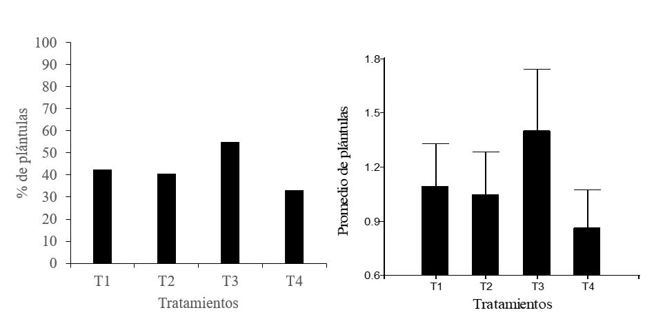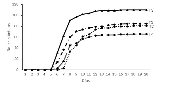 La inmersión de semillas en agua a 100 °C durante tres minutos (T3) aceleró la emergencia de plántulas y, además, fue el tratamiento con el mayor registro de plántulas emergidas con 110 de 200 (55%), seguido de los tratamientos en donde se sumergieron las semillas en ácido clorhídrico (T1 y T2), con 85 y 81 plántulas respectivamente; el testigo (T4) fue el que presentó el menor número de plántulas emergidas con 66, que representan el 33% del total de las semillas tratadas (Figura 1). Sin embargo, el análisis estadístico no mostró diferencias entre los tratamientos evaluados, aunque en las gráficas podemos notar diferencias numéricas; el T3 presentó el mejor resultado en este experimento, por lo cual podría recomendarse para aumentar la producción de plántulas (Figura 2).