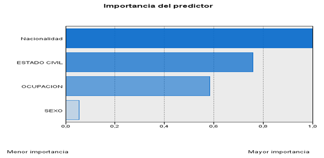 El conglomerado 2 (o tipo de delincuente 2) es el más grande, ya que reúne al 43.5% de la muestra, mientras que el conglomerado 4, el más pequeño, aglutina al 12.9%, para una relación proporcional entre ellos de 3.36. El conglomerado 1 contiene el 27.1% y el 3 al 16.5% de la muestra. La nacionalidad es la variable con mayor capacidad de predicción de pertenencia a un conglomerado, seguida, en orden decreciente de importancia, de estado civil, ocupación y sexo (Figura 3).