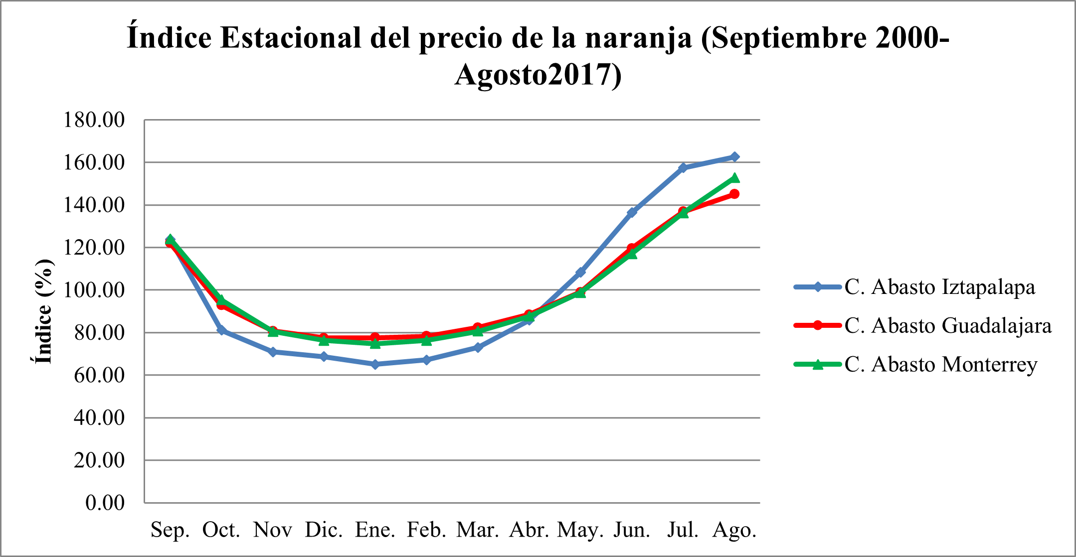 Los meses que coinciden con el periodo de mayor producción nacional provocan excesos de oferta y disminución en el precio de la naranja. Los valores mínimos del IE en los tres mercados se observaron en los meses de diciembre, enero y febrero. Los valores menores del IE fueron de 65.09% en la Ciudad de México, 74.70% para Monterrey y 77.43% para el mercado de Guadalajara, y se observaron en diciembre y enero.
