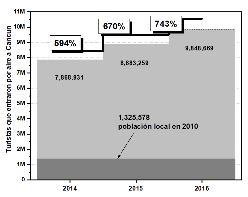 Una medición errada de la sustentabilidad en el caso de Quintana Roo consiste en no considerar como un riesgo este incremento de población, que ocurre de manera exponencial y que se materializa a través de cientos de vuelos anuales, tanto nacionales como internacionales (40 507 internacionales y 24 254 nacionales en promedio al año). Incluso, aquellas aproximaciones que contemplen este incremento de población como un riesgo que puede ser manejado con turismo alternativo incurren en el error de soslayar, en primer lugar, el considerable impacto que tienen los vuelos en el territorio por concepto de emisiones; en segundo lugar, la magnitud que tiene esa concentración en el uso de energía por concepto de alojamiento, traslado y alimentación; y en tercer lugar, el incremento de desechos sólidos resultante de la misma concentración poblacional. Todos estos son aspectos que tienen que ser considerados para analizar la sustentabilidad del destino.