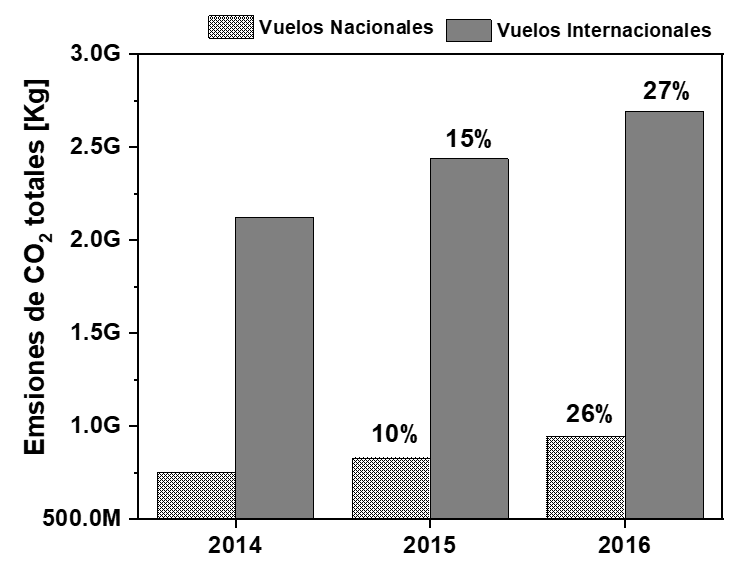 Este incremento de emisiones de CO2 se materializa en un aumento del 27% entre los años 2014 y 2016. Las emisiones derivadas de vuelos internacionales están por encima de los 2000 millones de kilogramos (Figura 5). Al mismo tiempo, en el caso de los vuelos nacionales también se observa una variación incremental, aunque oscilan en el orden de los 750 millones de kilogramos por año.