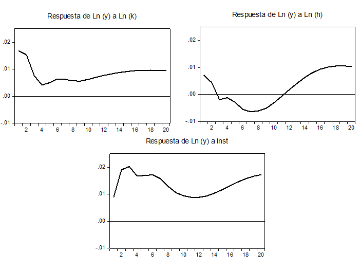 Los resultados de las funciones impulso-respuesta muestran que, en el caso de Ln(k), un choque positivo en la acumulación de capital físico permitirá una respuesta inmediata del crecimiento de la economía. Sin embargo, esta respuesta se mantiene solo dos periodos, luego empieza a reducirse para mantenerse en un nivel constante a largo plazo. Con respecto a Ln(h), un choque positivo en el capital humano generará un aumento del crecimiento económico, aunque menor que el efecto del capital físico. Sin embargo, este efecto empieza a diluirse debido a un aumento en los costos educativos. Posteriomente, a largo plazo, se observa que los retornos educativos comienzan a tener efectos crecientes en el desempeño económico. Por último, una mejora de las condiciones institucionales enfocada en un fuerte sistema legal que permita el respeto de los derechos de propiedad tendrán un impacto positivo en la economía en los primeros tres primeros periodos, posteriormente este efecto disminuirá, sin embargo, en el largo plazo seguirá siendo favorable al crecimiento económico.