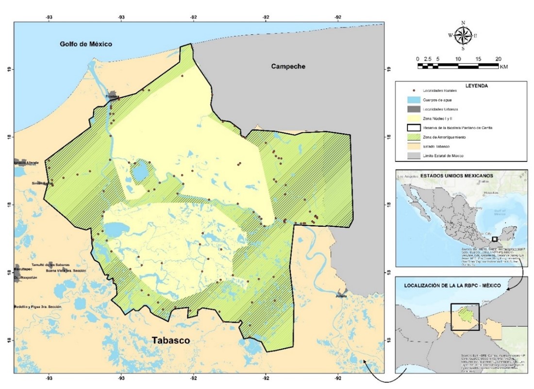 La RBPC se localiza al noreste del estado de Tabasco entre las coordenadas geográficas 17° 57’ 53’’-18°39’03’’ N y 92° 06’ 39’’-92°47’58’’ O, con una superficie de 302 706 ha. La mayor parte se localiza en el municipio de Centla, seguido de Jonuta y en menor proporción Macuspana, Tabasco; además, parte de su superficie se localiza dentro del estado de Campeche, México (INECC, 2000). Contiene dos zonas núcleo y una zona de amortiguamiento (Figura 1).