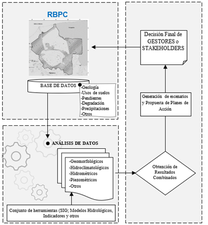 Ahora bien, en el marco de los resultados obtenidos, se considera relevante que, junto a esta infraestructura de monitoreo, también se construya un sistema de apoyo a la decisión (SAD) como herramienta de apoyo para los tomadores de decisión en la RBPC. Este esquema SAD debe considerar, entre otros aspectos, las variables hidroclimatológicas y geomorfológicas, como la precipitación, temperatura, caudales, uso del suelo, geología y parámetros de calidad de agua. Este tipo de esquemas responden a problemas complejos relacionados con los usos del suelo y los recursos hídricos, y para los cuales se tienen que crear indicadores claves para entender las dinámicas a las que están sometidas los territorios o zonas específicas (Payano et al., 2017). En tal sentido, los resultados obtenidos en la presente caracterización de la RBPC pueden servir de base para el diseño y construcción de un SAD que coadyuve a la gestión y la conservación de esta ANP. Desde esta perspectiva, se propone el esquema base mostrado en la Figura 10 para su discusión, diseño y potencial aplicación directa en la RBPC.