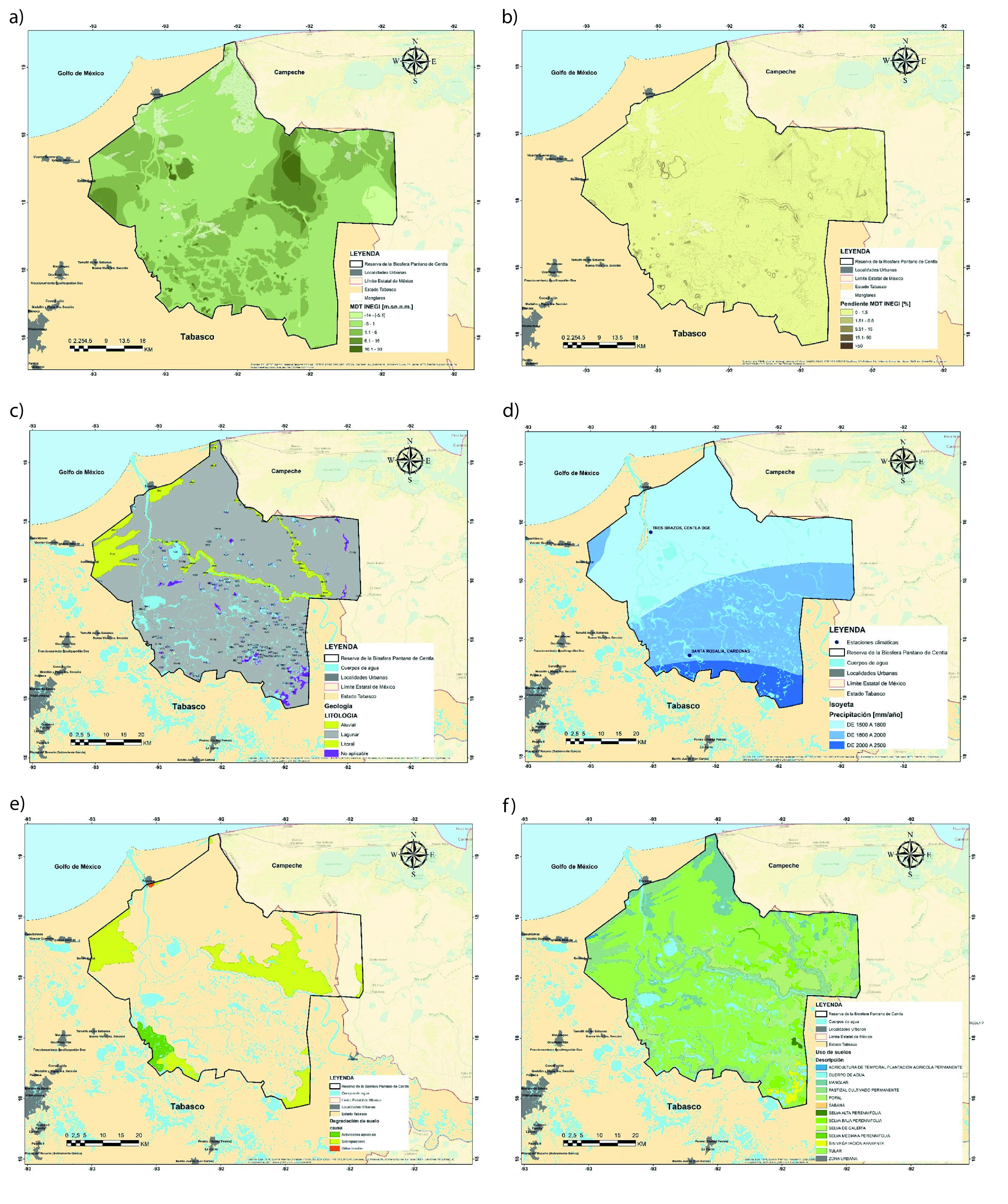 Por lo tanto, como se muestra en la Figura 3, la RBPC presenta elevaciones y pendientes propias de la planicie tabasqueña, con altitud y pendiente promedio de 1.36 m. s. n. m. y 0.32%, respectivamente (Figura 3a y 3b), donde en zonas de manglares y otros lugares de la Reserva existen alturas por debajo de -1.0 m. s. n. m. En cuanto a la geología, esta se encuentra influenciada por el drenaje del sistema fluvial Usumacinta- Grijalva, caracterizándose por depósitos aluviales y palustres de edad cuaternaria de origen sedimentario y unidades litológicas de aluvial, lacustre, litoral, palustre, arenisca, caliza y lutita (INECC, 2000) (Figura 3c). La precipitación en la zona registra valores entre 1500 mm/año a 2500 mm/año (Figura 3d). En lo relativo a la tipología de suelos, se tiene predominantemente Histosoles y Gleysoles con alta composición de materia orgánica y arcilla, con alta capacidad de retención de humedad. Asimismo, la degradación de los suelos en la reserva se atribuye a las actividades agrícolas, sobrepastoreo y la urbanización como causas predominantes (Figura 3e). Los usos de suelos presentes se agrupan en manglares, comunidades hidrófitas, pastizal, selvas inundables, áreas urbanas y actividades agrícolas (Figura 3f).