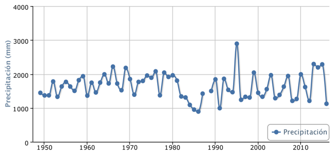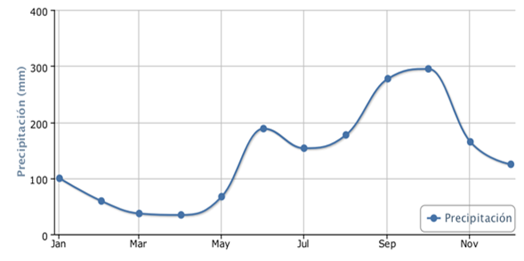 Respecto a la climatología, la información es muy escasa. En la zona solo existe una estación meteorológica vigente con información: Estación Tres Brazos (coordenadas: 19.6° O, 18.4° N) con mediciones de precipitación y temperatura desde 1948 hasta 2016 (Figura 4, 5 y 6). Según los datos de dicha estación, la precipitación media ronda los 1638 mm/año (139.8 mm/mensual), concentrándose entre mayo-octubre, siendo el mes de octubre el mes más lluvioso y abril el más seco. Además, la temperatura media anual alcanza los 26.5 °C, donde las mínimas se registran en entre los meses de diciembre a febrero (siendo enero el mes más frío con temperaturas por debajo de los 18 °C) y la máxima se presenta en el mes de mayo con temperaturas sobre los 33 °C.