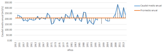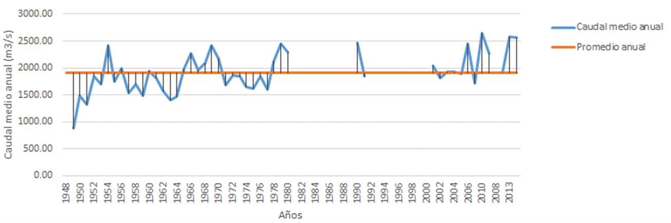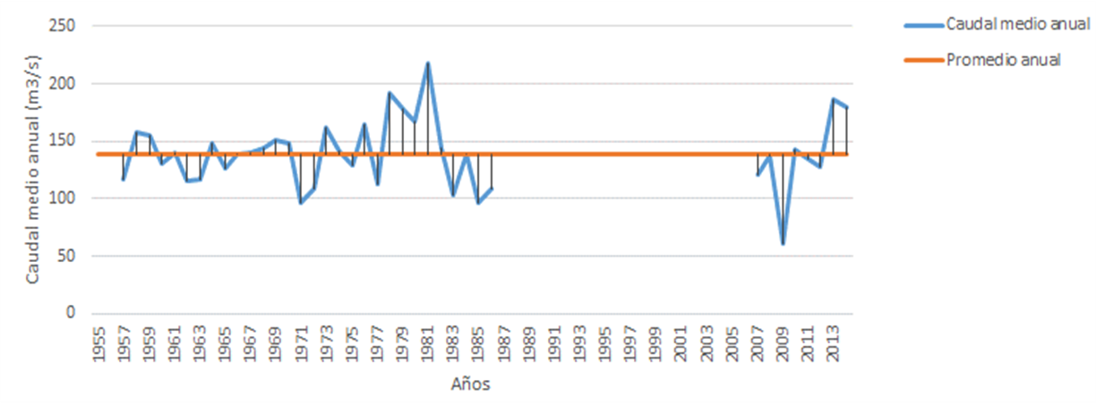 De acuerdo con el estudio de Conagua (2012), los ríos más importantes de la Reserva son el Grijalva, con un volumen anual de 27 013 Mm3, y el Usumacinta, con un volumen anual de 55 832 Mm3, que lo convierte en el más caudaloso de México. En este último se encuentran las estaciones hidrométricas: Macuspana (1956-2014), Boca del Cerro (1949-2014), Salto de Agua y San Pedro con disponibilidad de datos de caudales y niveles de agua. De estas, la estación Macuspana (Figura 7) es la más cercana a la zona de estudio y cuenta con un registro de datos de caudales, niveles de agua y volumen de sedimentos en el río Usumacinta desde 1957 hasta 2014, pero con un vacío de información de 20 años (período 1987-2006). De acuerdo con los datos de dicha estación, el caudal promedio anual registrado es de 138.95 m3/segundos, mientras que en otras estaciones cercanas se han registrado caudales medios de 210.15 m3/segundos (Salto de Agua) y 1916.47 m3/segundos (Boca del Cerro).