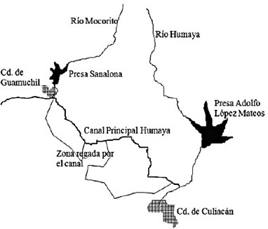 “El distrito se abastece principalmente de la presa Adolfo López Mateos, que inició su funcionamiento en septiembre de 1963 y se ubica sobre el río Humaya a 32 km al norte de Culiacán. El túnel número 1, con longitud de 588 m, descarga el agua al río Humaya, y el túnel número 2, con longitud de 603 m, conduce agua a una planta de generación de electricidad” (Pedroza & Hinojoza, 2014).