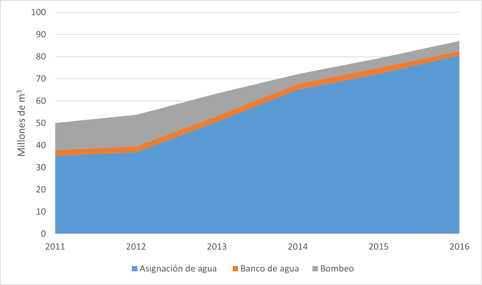 El suministro de agua depende de la disponibilidad en presa y de las precipitaciones. Con base en esto, se distribuyen proporcionalmente a los módulos del distrito de riego considerando el tamaño que tienen registrado. En el apartado anterior se mostraron las fuentes de obtención del recurso hídrico. Y como ya se comentó, aunque en ambos módulos la asignación es creciente, el I-3 ha incorporado de manera informal mayor extensión de tierras, comprometiendo la suficiencia del recurso.