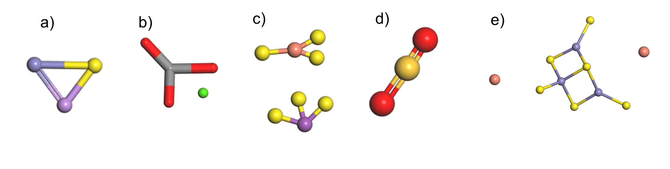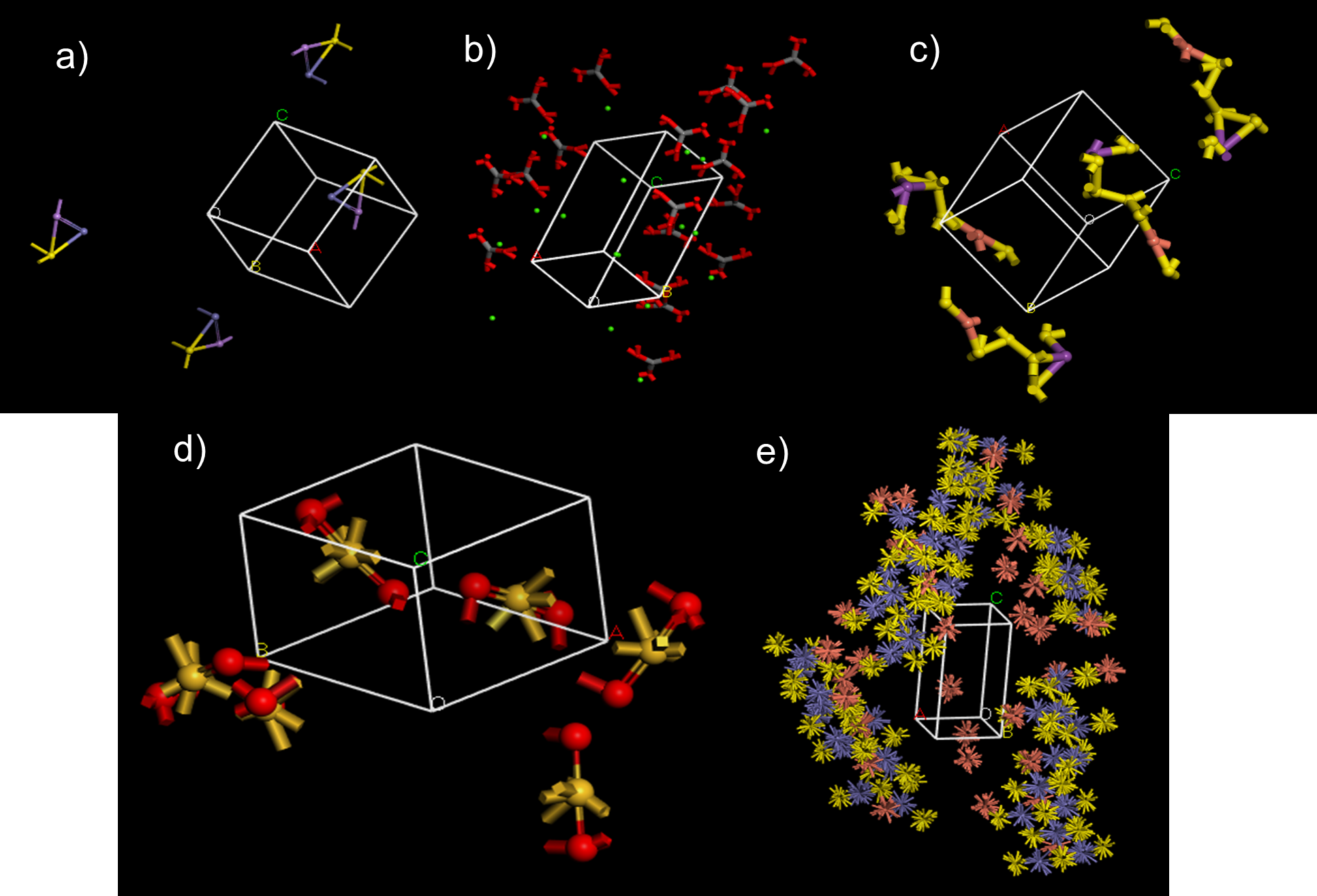 Each crystal was created according to the specific lattice parameters, as well as the space group (BIOVIA, 2014a). For instance, arsenopyrite crystallizes in a monoclinic system in a space group P 2(1)/c, and it is composed of 46.01% arsenic, 34.30% iron, and 19.69% sulfur (Figure 3a). Calcite is a mineral of calcium carbonate whose crystallization system is trigonal and its space group is R3*c, which is made up of 40.04% calcium and the rest is carbonate (Figure 3b). Wittichenite is a very rare mineral that crystallizes in an orthorhombic system; its space group is P2(1)2(1)2(1); and it is composed of sulfur, copper, and bismuth in 19.40%, 38.45%, and 42.15% respectively (Figure 3c). Quartz is one of the best-known minerals on earth. It is composed of 46.74% silicon and the rest is oxygen, it crystallizes in a trigonal system and its space group is P 3 (2) 21; its structure can be seen in Figure 3d. Chalcopyrite, with a tetragonal crystallization system and an I-42D space group, is composed in equal parts of copper and sulfur (34.78%) and the rest is iron (Cambridge Crystallographic Data Center [CCDC], 2020; Crystallography Open Database, 2020; Mineralogical Society of America [Minsocam], 2017) (Figure 3e).