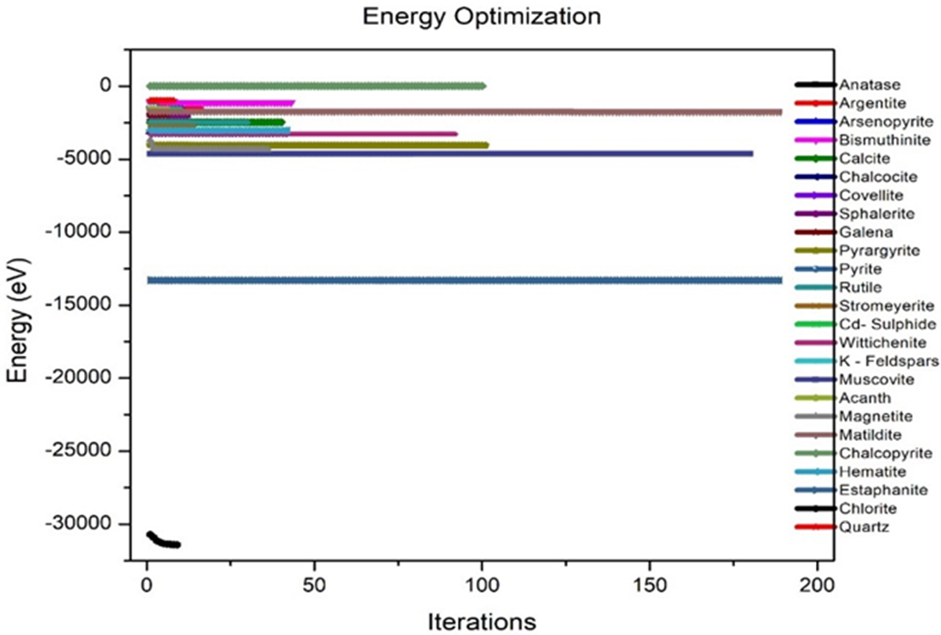 All the crystalline structures present in the mineragraphic analysis were simulated in the visualizer module, and the optimization of the geometry of 95% of the structures created using the Quasi-Newton BFGS method in the CASTEP module was achieved. On the other hand, all crystals of the optimized structures were created, each one with the corresponding parameters and angles, and 72.5% of the structures were validated by comparing the X-ray diffraction pattern against the simulated pattern. Finally, once the simulation is validated, the metal recovery process can be made more efficient by avoiding time investment in experiments and the use of reagents.