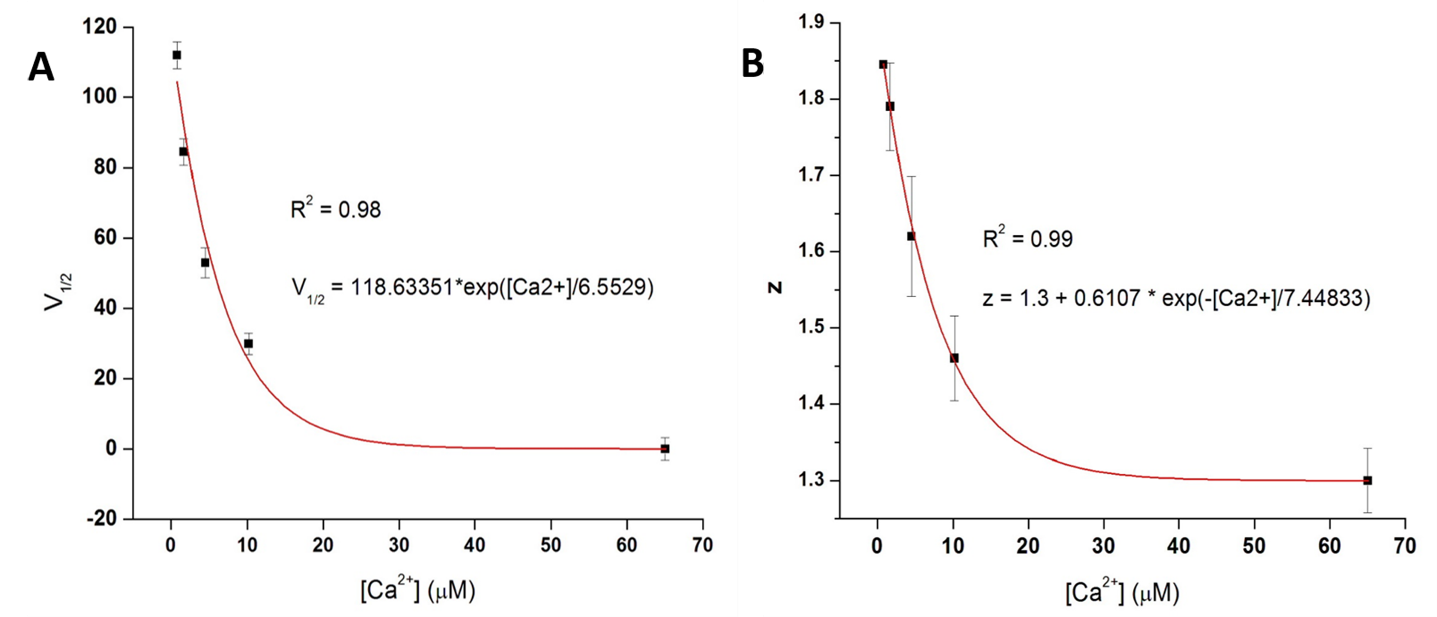 Figura 2 Ajuste de datos experimentales. a) Gráfica V1/2 -vs- Ca2+. V1/2 disminuye exponencialmente conforme se incrementa [Ca2+]i. La precisión del ajuste fue R2 = 0.98. b) Gráfica para los valores de z con respecto de [Ca2+]i. Se muestra que a valores pequeños de Ca2+, z es mayor y disminuye exponencialmente conforme aumenta el Ca2+. La ecuación ajustó los datos con R2 = 0.99.