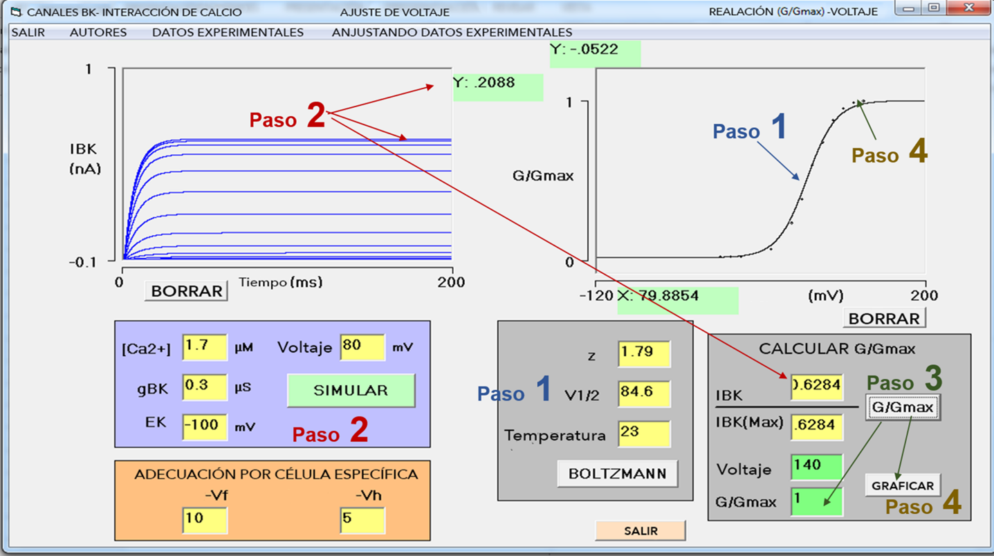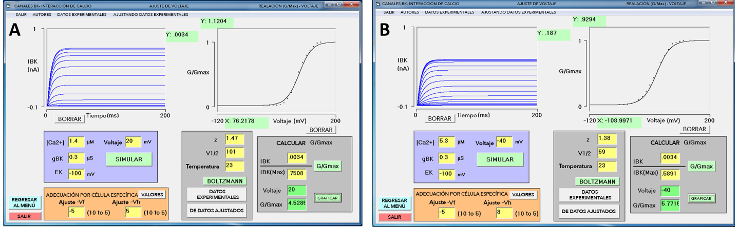 La Figura 3 muestra la interfaz de usuario, cuenta con cuatro módulos de entrada de datos. Módulo I: [Ca2+]i (µM), g BK (µS), E K (mV) y voltaje aplicado (mV). Módulo de ajuste: V f y V h (mV). Módulo de Boltzmann: z, V 1/2 (mV), temperatura (Co). Módulo de conversión de I BK a conductancia BK (GBK): I BK (nA), I BKmax (nA), voltaje aplicado (mV), normalización G/G max (conductancia/conductancia máxima). En la parte superior izquierda se despliega l BK , y del lado derecho se grafica la relación G-V normalizada.