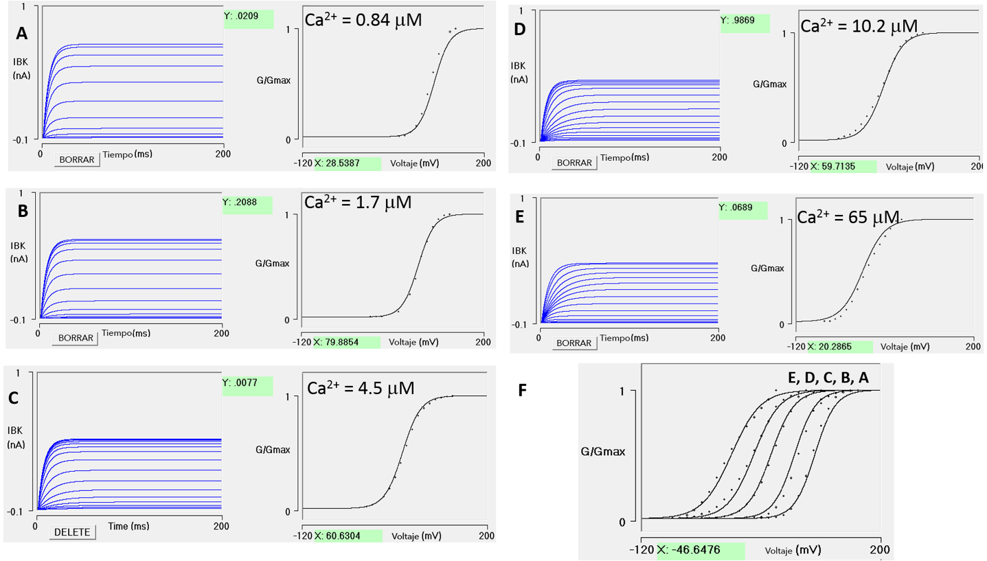 Nota: Simulaciones a 0 µM y 100 µM. El simulador permite la simulación a cualquier concentración de Ca2+. Los trazos de IBK corresponden a [Ca2+]i = 100 µM. Las curvas G/Gmax - V corresponden, de izquierda a derecha, a 100 µM y 0 µM con -1.23 y 83.98 para V1/2, respectivamente. La sensibilidad al Ca2+ estimada fue 85.21.