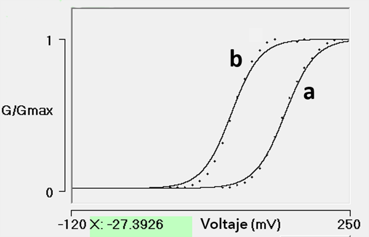 Ejemplo 2. Experimentos en células HEK-293 transfectadas con canales BK (Guan et al., 2017). Aquí se presentan las simulaciones con canales BKα en condiciones control y en presencia de un activador del canal (malotoxina, 2 µM) en ausencia de Ca2+, para determinar el grado de activación alcanzado por esta droga activadora. La Figura 8 muestra la relación G-V. La curva b corresponde al experimento con malotoxina (línea continua). La curva a es el resultado del experimento control (línea continua). Los puntos son el resultado de las simulaciones. Se realizaron ajustes con la ecuación de Boltzmann, y se mostró que entre los datos experimentales y los simulados no existen diferencias (p > 0.05). La Tabla 3 conjunta los datos estadísticos de los experimentos y simulaciones de Sweet & Cox (2008) y Guan et al. (2017). El grado de activación alcanzado por la malotoxina en la simulación fue: ΔV1/2 ≈ -69.52 mV: ΔV1/2 = V1/2(malotoxina) - V1/2(0 mV); esto es, ΔV1/2 = 93.15 - 162.67 (mV). Contra la activación experimental: ΔV1/2 = -72 mV. No existen diferencias estadísticamente significativas p = 0.33.