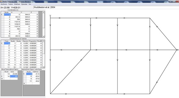 Con la finalidad de mostrar el procedimiento que se sigue al ingresar una red hidráulica presurizada en el programa RedesUAZ, y así comparar los resultados que este arroja con relación a otras alternativas, en este estudio se trabajó con la red hidráulica propuesta por Huddleston et al. (2004). El ejemplo de estos autores incluye 14 nodos (dos para almacenamientos superficiales, cuatro con demanda de caudal y ocho solo para unir tuberías) y 21 tramos de tubos. Primeramente, desde el módulo Tubos en la opción Coordenadas se ingresan los valores X, Y, Z para los nodos. Luego, desde la opción Tubos se construye la red hidráulica, por lo que los nodos definidos en el paso anterior se ingresan en Nudo i o Nudo j, según corresponda, en el entendido que la dirección del flujo será de i a j. Al ser arbitraria la definición anterior, el proceso iterativo con el cual se resuelve la ecuación 9 corregirá la dirección tal que se cumpla con lo dispuesto en la ecuación 1.