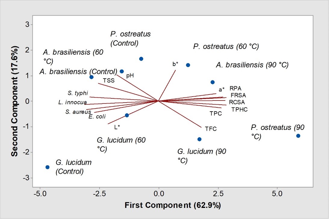The data of the thermal x time effect on pH, TSS, and color values of edible mushroom extracts (EME) are summarized in Table 1. The results showed that pH and TSS values of control samples were above 5.0% and 16.5%, respectively. At a higher temperature and time (90 °C during 6 h), pH values decreased (p < 0.05) by 12.7%, 13.7%, and 14.5% for A. brasiliensis, G. lucidum, and P. ostreatus extracts, in comparison to control samples; while TSS values decreased by 24.7%, 49.4%, and 57.6%, respectively.