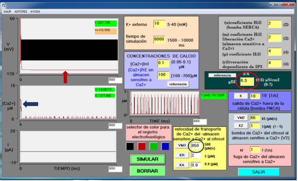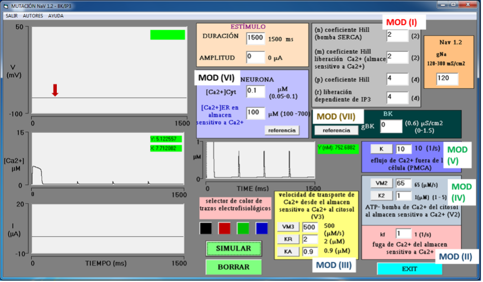 Los dos simuladores cuentan con seis módulos (MOD) iguales para la entrada de datos (Figura 1): MOD I es el módulo de IP3 y gestión de oscilaciones de calcio intracelular que muestra las variables: n, m, p y r con valores iniciales de 2, 2, 4 y 4, respectivamente; MOD II es el módulo de salida de calcio hacia el citosol desde el almacén sensible a calcio, muestra la variable de fuga de calcio kf con valor inicial de 1 1/s; MOD III es el módulo de velocidad de salida de calcio por IP3, donde se encuentra la variable V3, relacionada con VM3, KR y KA con valores iniciales de 500 µM/s, 2 µM y 0.9 µM, respectivamente. MOD IV es el módulo para disminución de calcio intracelular por la bomba ATP (SERCA), bomba que ingresa calcio del citosol al almacén sensitivo a calcio, en este módulo se muestra las variables VM2 y K2 con valores iniciales de 65 µM/s y 1 µM, respectivamente; y MOD V es el módulo para la bomba PMCA que produce un eflujo de calcio hacia el espacio extracelular, aquí se muestra la variable K con valor inicial de 10 s-1. Los valores iniciales de estos cinco módulos derivan de Keener y Sneyd (Keener & Sneyd, 1998). MOD VI es el módulo que determina las concentraciones libres de calcio en el citoplasma y en el retículo con [Ca2+] = 0.1 µM y 100 µM, en el citosol y el retículo endoplásmico, respectivamente (Foskett et al., 2007). Estas condiciones propician una salida abrupta de Ca2+ del retículo, con una duración corta a manera de destello (spark) (Cheng & Lederer, 2008). Estos módulos corresponden a las variables que gobiernan el modelo de Goldbeter (1990). Finalmente, MOD VII es el módulo que determina la presencia de canales BK en la neurona, con variable gBK, con valores iniciales de 0 µS/cm2, condición control, sin canales BK (Figura 1).