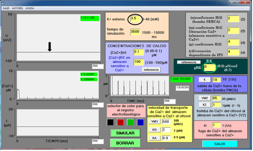 Este simulador cuenta con un módulo de entrada de datos específico, donde se puede aumentar la concentración de potasio externo y el tiempo de simulación. Los valores iniciales para estas variables al ejecutarse el simulador son: [K+]e = 3.5 mM (círculo negro) y un tiempo de simulación de 3500 ms. Las demás variables permanecen con valores iniciales descritos arriba. En estas condiciones la neurona no dispara potenciales de acción, es silente (Figura 4, flecha negra).