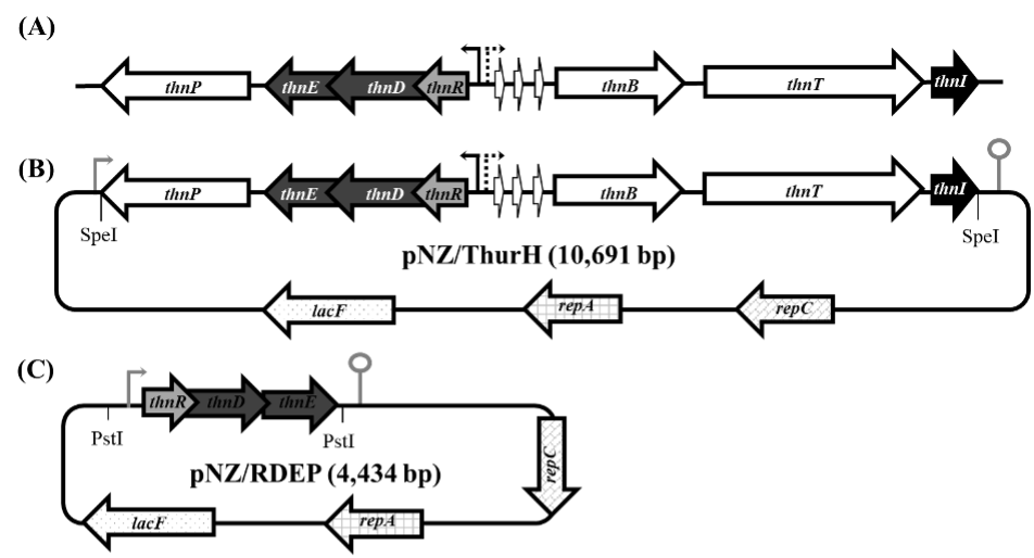 Se utilizó una polimerasa de alta fidelidad de acuerdo con las especificaciones del proveedor. El fragmento amplificado de 8141 bp y el vector pNZ8149 se digirieron con la enzima SpeI (NEB). El vector, además de ser digerido, también se desfosforiló con CIP (Calf Intestinal Phosphatase, NEB). Los fragmentos se ligaron con la enzima T4 DNA ligasa (NEB) en proporción 1:2 vector, inserto. La reacción de ligación se transformó en L. lactis NZ3900 electrocompetentes, y se seleccionaron colonias crecidas en Elliker con lactosa 0.5%. Las colonias seleccionadas se crecieron en medio líquido Elliker con lactosa 0.5%, y se extrajo DNA plasmídico (Birnboim & Doly, 1979). El DNA fue digerido con la enzima SpeI para identificar a las clonas positivas que además se confirmaron por PCR; la construcción completa se nombró pNZ/ThurH. A partir de esta última se elaboró la construcción pNZ/RDEP, la cual contiene al operón thnRDE (tres genes implicados en la inmunidad) y al gen thnP; los cuatro genes fueron clonados en el vector pNZ8149 siguiendo el mismo procedimiento que para pNZ/ThurH. Los oligonucleótidos utilizados para la amplificación fueron:
