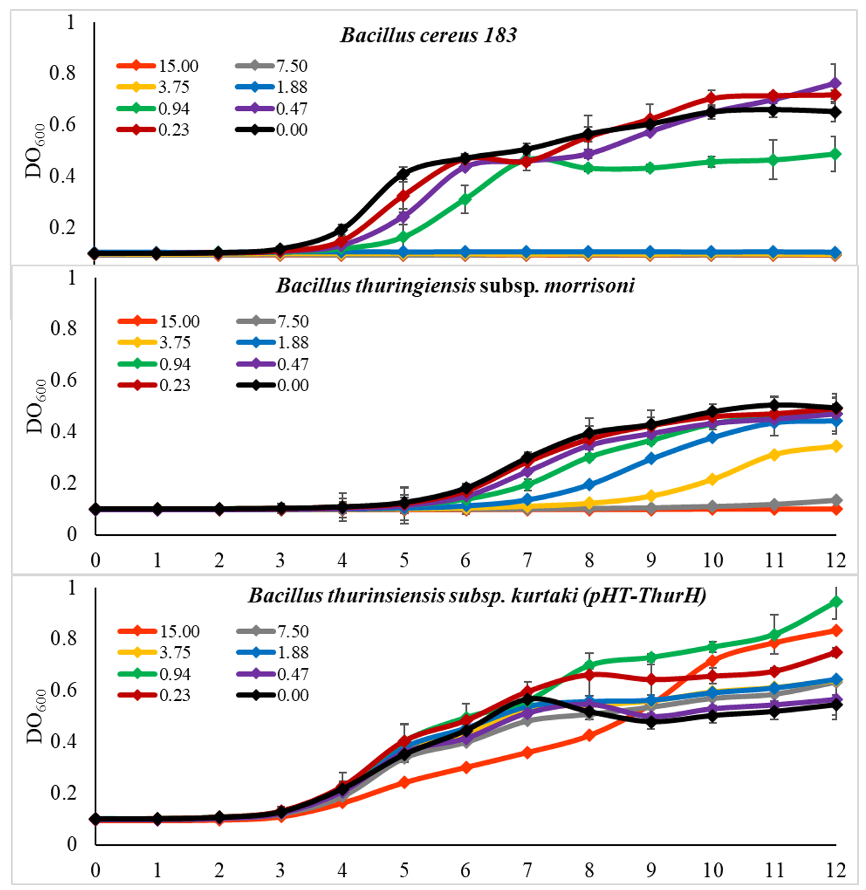 Antes de determinar la concentración mínima inhibitoria (CMI) contra L. lactis, se determinó la CMI contra las cepas Bacillus cereus 183, Bacillus thuringiensis subsp. morrisoni y Bacillus thuringiensis subsp. kurstaki Cry-B, esta última transformada con pHT/ThurH. Se dejaron precultivos de cada cepa a partir de una colonia individual en medio TSB, se cultivaron durante 16 h a 28 °C con 200 rpm de agitación. Al día siguiente, los precultivos se diluyeron a una densidad óptica (DO600) de 0.1 en un volumen de 200 µl y se les adicionaron 50 µl de thurincina H en concentraciones 0 µg/ml, 0.2 µg/ml, 0.5 µg/ml, 0.9 µg/ml, 1.9 µg/ml, 3.8 µg/ml, 7.5 µg/ml y 15 µg/ml. Las cepas se incubaron a 28 °C con agitación y se tomaron lecturas de DO600 cada hora en un lector de placas (Synergy HTX, Biotek). El experimento se realizó por triplicado.