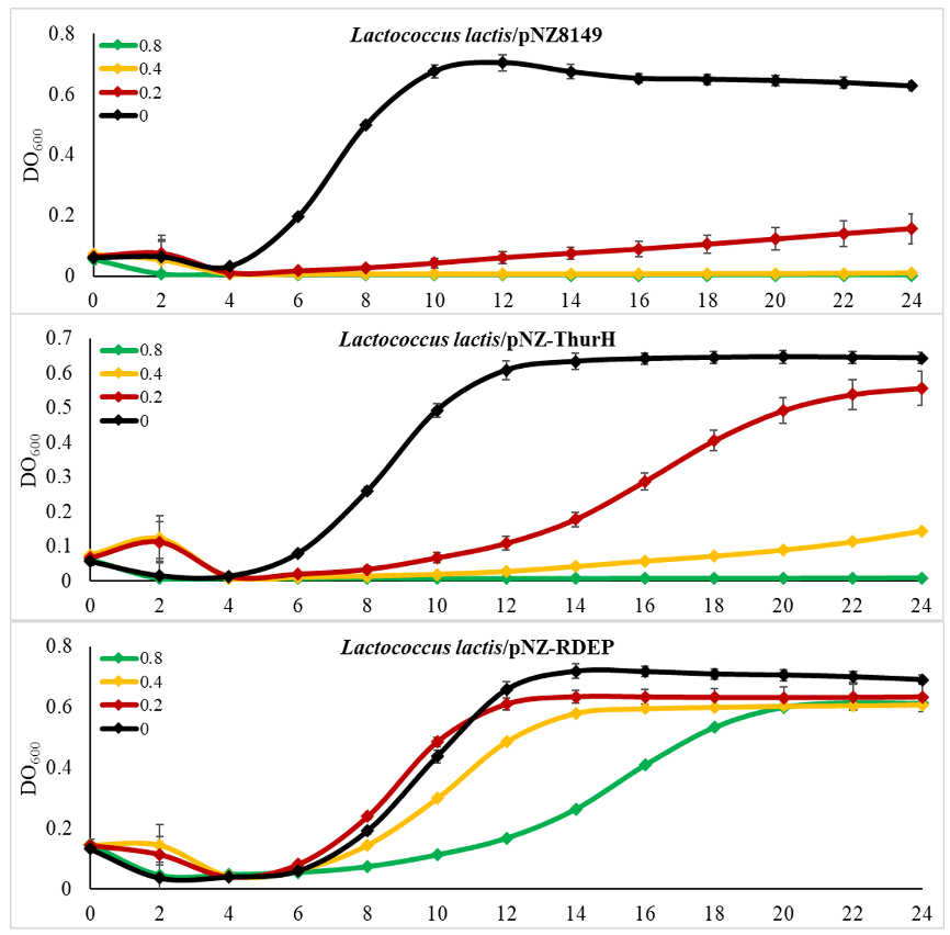 Una colonia de las cepas L. lactis NZ3900 silvestre, L. lactis transformada con pNZ8149 (vector vacío), pNZ/ThurH y pNZ/RDEP se sembraron en Elliker con lactosa 0.5%, y se incubaron sin agitación durante 16 h a 30 °C. Al día siguiente los precultivos se diluyeron a una densidad óptica (DO600) de 0.1 en un volumen de 200 µl y se les adicionaron 50 µl de thurincina H en concentraciones 0 µg/ml, 0.2 µg/ml, 0.5 µg/ml, 0.8 µg/ml. Las cepas se incubaron a 28 °C sin agitación en un lector de placas (Synergy HTX, Biotek) y se tomaron lecturas de DO600 cada dos horas durante 24 horas. El experimento se realizó por triplicado. Es importante mencionar que el ensayo se realizó sin nisina como inductor.