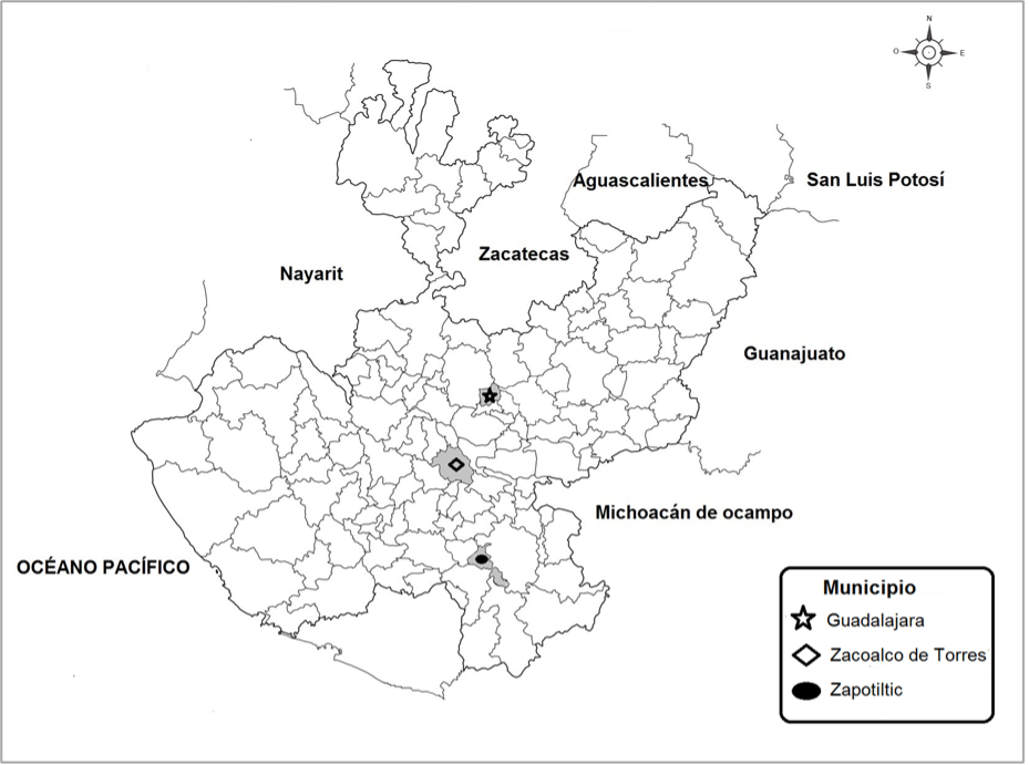 Figura 1 Ubicación geográfica de los municipios bajo estudio, dentro del estado de Jalisco.
