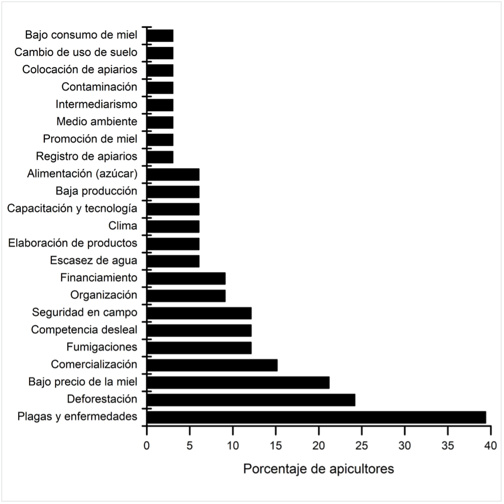Al igual que muchas otras áreas de la ganadería, la apicultura depende de la eficiencia con la que el productor desarrolle las prácticas de manejo y de cómo atienda los problemas que enfrenta su unidad de producción; por tanto, cada apicultor podría tener una percepción diferente de sus áreas de mejora. Los apicultores de la región centro-sur del estado de Jalisco percibieron 23 problemas que limitan su desempeño productivo y que requieren apoyo para su solución (Figura 2). El principal problema referido por cerca del 40% de los apicultores entrevistados fue la presencia de plagas y enfermedades en los apiarios, en tanto que los problemas del bajo precio de la miel y deforestación fueron mencionados por un quinto de la población estudiada.