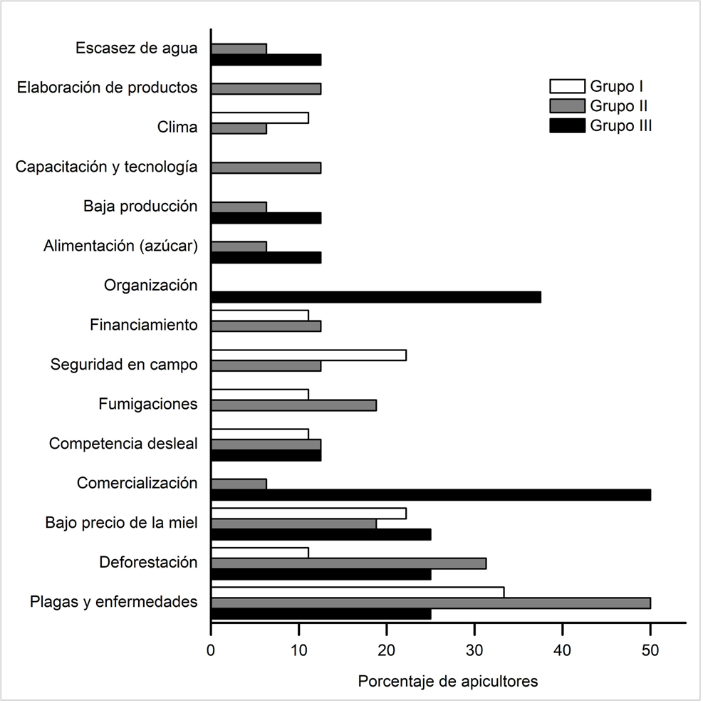 El problema de plagas y enfermedades fue referido por apicultores de los tres grupos. No obstante, al realizar un análisis por grupo (Figura 3), se observó que existen problemas que afectan en mayor medida a cada uno de los conjuntos de apicultores. Por ejemplo, para el Grupo I, el tema de seguridad en el campo es considerado como prioritario para mejorar la actividad; en el Grupo II, la deforestación y fumigaciones deberían ser atendidos como un tema básico debido a que causa alta mortalidad de las abejas; y los apicultores del Grupo III resaltaron los problemas de comercialización y organización como puntos importantes dentro de la actividad apícola. Por el lado de la comercialización, debido a la venta de la miel a granel, los productores hacen frente a los bajos precios y a la competencia desleal en el mercado. De acuerdo con la Coordinación General de Ganadería (2010), esta forma de comercialización facilita la venta de miel adulterada y otros productos como si fuesen miel.