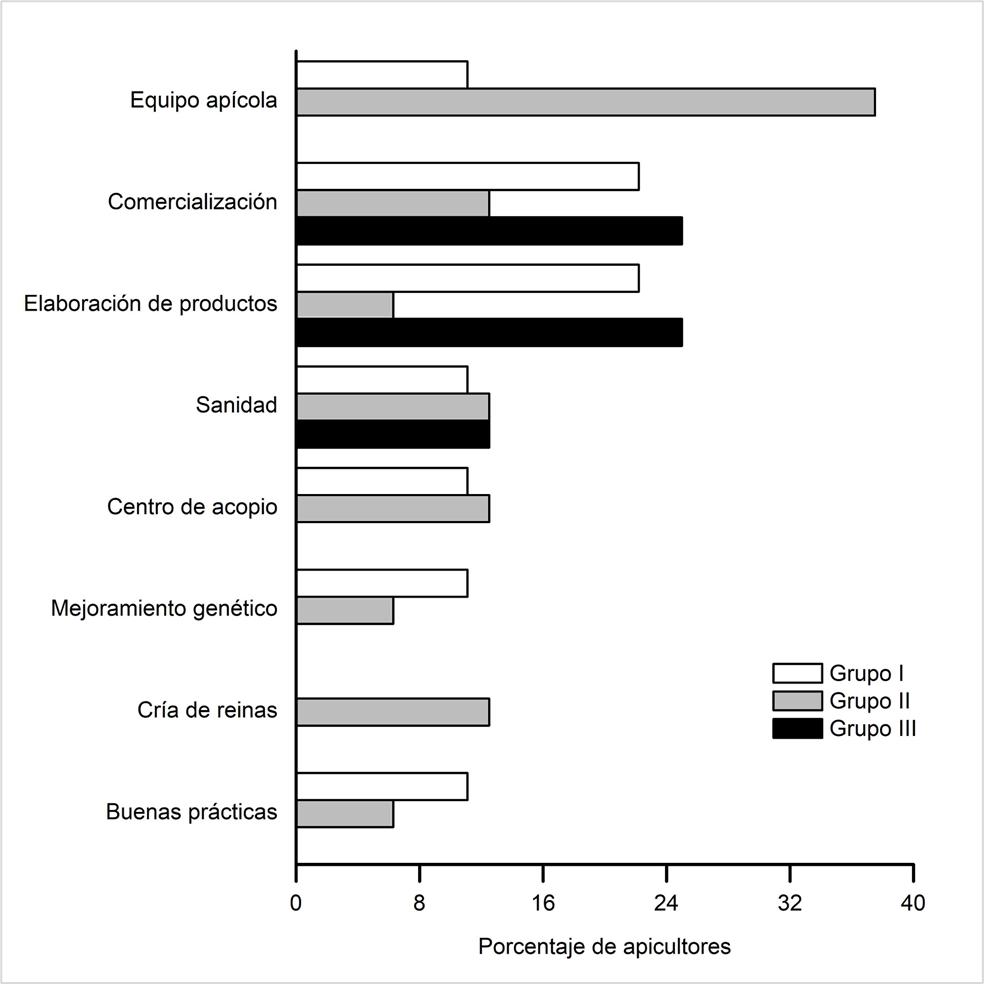 En el análisis por grupo (Figura 5) se observó que existe diferente apreciación sobre los conceptos donde los apicultores consideran la necesidad de capacitación o avances tecnológicos. Entre los apicultores del Grupo III resalta la necesidad de capacitación en temas de comercialización y elaboración de productos. Por su parte, los apicultores del Grupo II fueron los únicos que mencionaron la necesidad de un mayor entrenamiento en temas relacionados con la cría de abejas reinas (Apis mellifera), también hicieron énfasis en la necesidad de la adquisición de equipo apícola y en habilitar un centro de acopio. Estos dos últimos puntos también fueron referidos por el Grupo I.