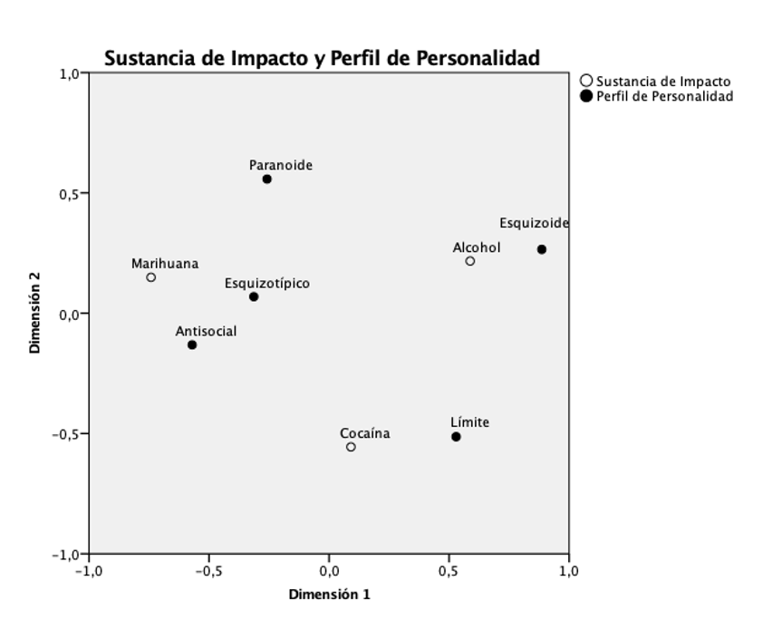 El análisis incluyó solo varones. Las distancias relativas entre los puntos indican el grado de asociación de las sustancias de impacto con los perfiles de personalidad. De esta manera, se puede apreciar mayor relación del perfil esquizoide con el consumo de alcohol, así como de los perfiles esquizotípico y antisocial con el consumo de marihuana. Las dimensiones corresponden solamente al modelo generado en el análisis de correspondencias.